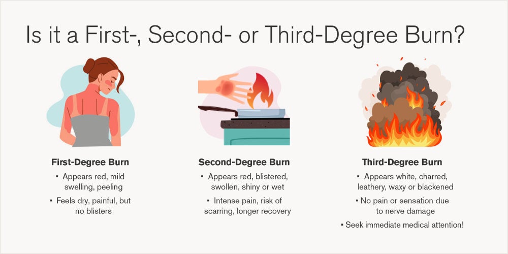 The severity of burns can be dramatically different from one patient to another. There are three types, or degrees, of burns, categorized by how deep the burn has penetrated the skin.